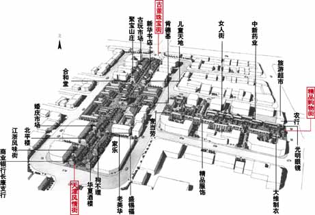2001年,“鼓楼商业街”名贯整个津城,让沉默数百年的天津老城,重新成为天津人的骄傲。鼓楼商业街新建的每条街道都各具特色,鼓楼北街将延续津派古迹的文脉,建成工艺品古董珠宝一条街;鼓楼东街建精品购物街;鼓楼南街建天津风情街。三条街道的布置均以鼓楼作为视线焦点,但店铺并非固定在一条直线上,而是有出有入,形成宽窄有序的街道平面。改造后的商业步行街将是一条极具观赏价值的现代休闲商业街。