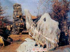站在奇石北园南侧的中部,你会看见矗立在面前的这座巨石,高10.7米,重73吨,号称亚洲第一石。雨水在它身上冲出千沟万壑,记录着久远的历史,岁月的沧桑。它酷似一尊观音,身披袈裟,面朝西天禅悟。禅者,静也;悟者,洗心涤虑,脱俗离尘。由它脚下步入园中,便如同走进了远古石城的遗址。你看这条黄土古道,两侧林立着嵯峨巨石;你看这片树丛前,恐龙引颈,石鸟欲飞,羊卧地,兽直立;往左一看,巨大的石蜥爬过来,往右一看,黑色的象群刚走过。沙地上奇异怪兽争强斗胜,枯竹背后白色骆驼昂首远望。