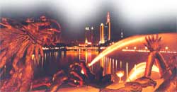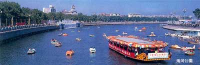 再向西行,就到了噴泉游樂場。這里的海河水面上,龍船、快艇、鴛鴦船,隨波游蕩,輕松自如,歡聲笑語,不時在空中回蕩;鯨魚號、黃蓮圣母號等大型游船,載著來自不同地區,不同行業的游客,浮波而行,兩岸的旖旎風光盡收眼底。位干游樂場中心的是大型聲控噴泉群,20多米高的水柱騰空而起,伴隨著悠揚、明快的樂曲,又分別展示幕帘狀、涌泉狀、霧球狀、喇叭狀……到了夜晚,160盞水下彩燈,大放光華,水柱被涂上了瑰麗的色彩,頓時變成童話般世界,不知陶醉過多少游人。