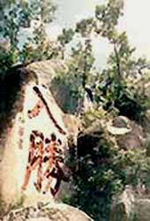 盤山石也是頗具特色的景觀,而欲盡情領略“石胜”之妙,先要到中盤。中盤位于紫蓋峰、蓮花峰、毗盧峰之間。中盤之石形狀各异,有的如爺面視天,有的如劍峰插云,有的如懸垂欲墜,有的如龜縮谷底……隨著視覺想象,人們仿佛驀然置身于奇异的國度。《盤山志》記載,盤山有26處名石。這些奇异的名石,或因其狀象形得名,或因神奇的傳說得名。典志記敘較多的是8大怪石,即:將軍石、懸空石、喝斷石、搖動石、蟒石、菱角石、晾甲石、帳房石。位地由青松岭東頂通達挂月峰路上的將軍石,孤立無依,側望酷似一位威武的將軍,戍衛在山崗。