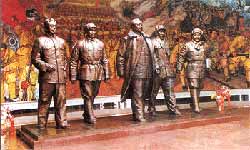 序廳—— 大廳正中央的鑄銅雕像《走向胜利》,表現了中共中央毛澤東和劉少奇、朱德、周恩來、任弼時五位書記的領袖風采;牆屏上毛澤東主席關于平津戰役作戰方針的浮雕手跡熠熠生輝;環周巨幅壁畫《胜利交響詩》反映了東北、華北兩大區軍民英勇奮戰、奪取戰役胜利的宏大場面。