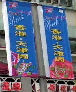 在香港街頭,高大建筑物前及主要街道路口都飄揚著紅黃藍白綠五色相間的彩旗,上面用中英文醒目地印著“2001香港•天津周”的字樣、怒放的月季和紫荊花圖案,標志著津港兩地將通過這次活動進一步加深了解、加強聯系,共同促進兩地的繁榮發展