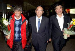 10月21日,中国足球队结束世界杯足球预选赛亚洲区十强赛最后一场比赛后回到北京。中国队以8战6胜1平1负的战绩,第一次打进世界杯足球赛决赛。这是中国队主教练米卢、国家体育总局副局长李志坚(中)、中国足协副主席阎世铎(右)走出首都机场。