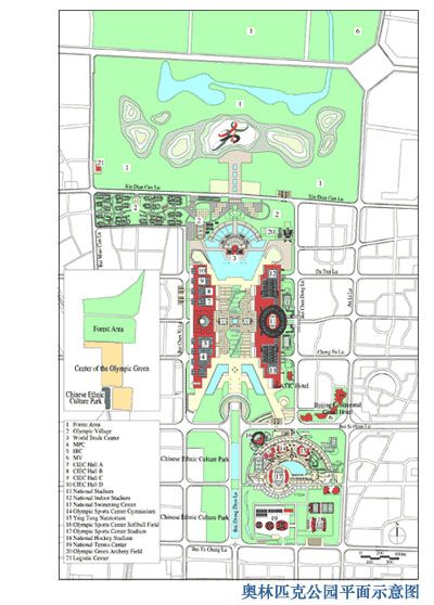 奥林匹克公园面积约1215公顷,其中包括760公顷的森林绿地、占地50公顷的中华民族博物馆以及占地405公顷的展览馆、体育场馆及奥运村。