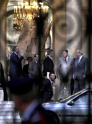 9月11日,美国纽约世贸中心和华盛顿五角大楼发生飞机撞击恐怖事件后,法国总统希拉克和总理若斯潘以及政府负责安全的有关部长在爱丽舍宫举行紧急会议,宣布在全国实施反恐怖紧急措施——“警惕海盗计划”。图为会议结束后,法国外交部长韦德里纳(右一)和内政部长达扬(右二)等在爱丽舍宫的台阶上等车。新华社记者 李根兴摄