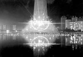 天塔湖的水幕夜景正在紧张调试。昨天凌晨,工作人员开始调试湖面的水幕激光动画。两组激光器在扇形的水幕上打出五彩变幻的几何图型和动画卡通形象。 (祁小龙)