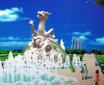 主雕塑“跨越”高达20米,是全国最大的石雕龙,石雕龙底座外围是直径50米的三层喷泉,池外是大型旱喷泉相衬,水花在空中交织与雕塑浪花融为一体,飞龙在水中冲天而起。主雕塑取材于古老民间传说“鲤鱼跳龙门”,石雕底部大鱼尾和掀起的巨浪,显示了跨越的基础和浑厚的力量,寓意天津经过多年的改革开放,已具备跨越式发展的底蕴,彩虹(金属)做龙门,寓意跨越时逢发展机遇;鲤鱼越过龙门,身躯已幻成巨龙,右龙爪有力前伸,左龙爪蓄势待发,显示发展势不可挡,寓意天津跨越式发展已发生质的变化;上翘的鱼尾即将拨动,巨龙势将冲入云霄,。“跨越”主题内涵“潜游蓄势三百年,一跃龙门冲九天”,寓意天津跨越式发展已成不可阻挡之势。主雕塑隐喻天津“依水而立,因水而兴”的悠久历史,象征着天津人民自强不息,开拓创新的精神和文化,充分体现了市委七届七次全会提出的跨越式发展思路,具有鲜明的时代特征,预示着天津是跨越式发展和必将跨入国际大都市行列的美好未来。雕塑整体高20米,底部近似圆形,直径20米,龙颈高约8米,主材料为北京房山清白大理石。(王冰)