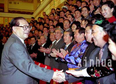 | | 10月26日,中共中央总书记、国家主席、中央军委主席江泽民在北京人民大会堂会见出席中华全国新闻工作者协会第六届理事会第一次会议的全体理事和代表。(王新庆摄) |
