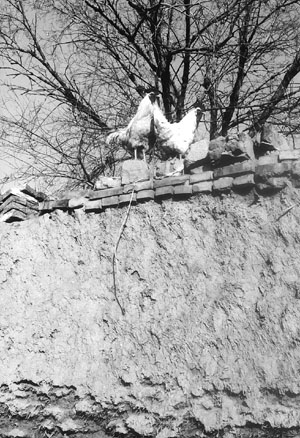 本市东丽区李明庄村安徽来村打工的张某,春天买了一批小公鸡留过节吃肉,一次在存活的七只公鸡中,有一大一小的两只因争食啄起架来。那只大的因身大力大占了上风。小一点的那只,因为头脸掉了不少羽毛,还有几处出了血,而退下阵来。但大公鸡不依不饶,又追过去猛抓猛啄。另一只观战的公鸡竟抱打不平,跑过去帮小公鸡参战。大公鸡终因寡不敌众而悻悻作罢。从此,这只小公鸡与拔刀相助者便交了朋友:甲发现食物咕咕通知乙,乙发现好吃的赶紧召唤甲,俩鸡要有一只扬头打鸣,另一只准引吭高歌。大公鸡素来有登高上房的习惯,小公鸡也总是吃力地飞上随同。主人开玩笑地说:“它俩搞同性恋呢。”(陈玉贵)  | | “好哥俩”正站在高墙上并肩眺望高歌 |