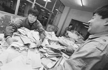 昨晚,天津邮区中心局迎来了一年中最繁忙的一天,全市日进出口信函总量达到了今年最高峰——190多万件,比平时50万件高出了将近4倍,把职工们忙得不亦乐乎。