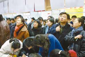 今年本市第一场大型招聘会———“第四届人才聚焦”招聘会于昨日在体育中心举行,场面火爆。祁小龙摄