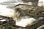 2002年1月20日13点40分,随着指挥人员一声令下,重庆奉节旧县城永安镇政府的楼房轰然坍塌。“三峡清库第一爆”顺利炸响。 “第一爆”的准备时间长达十多天,起爆准备时间也超过30分钟,但是,整个爆炸过程不到10秒钟。 楼房向东北方向,坍塌在预定范围内 爆炸对周边建筑物和围观群众没有造成伤害。