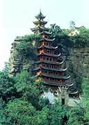 从重庆乘江轮东下,首先映入眼帘的是忠县的石宝寨,这是一幢四壁如削的石结构古建筑,高50余米,矗立在忠县以东长江北岸玉印山上,全寨由寨门、寨身层楼及寨顶古刹三部分组成。清乾隆初年,借助架于石壁上的铁索在山顶修建了一座寺庙,嘉庆年间又聘请能工巧匠研究如何取代铁索上山,于是便依山取势修建成这座楼阁。寨中楼阁九层,四角三方,层层扶壁而上,为登山的唯一路径。山顶古刹名天子殿,共三重,创建于康熙年间,凭栏远眺,滚滚长江,无限景色,一览无余,被誉为“世界八大奇异建筑之一”。从此,香客及游人可免攀援铁索之苦,上楼直达山顶,直到1956年又加以修建改为12层,如今这里已成为游客眺望长江景色的小蓬莱了。