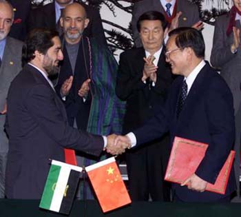 会见后,朱镕基和卡尔扎伊出席了《中华人民共和国政府向阿富汗临时政府提供3000万元人民币紧急物资援助的换文》和《中华人民共和国政府向阿富汗临时政府提供100万美元现汇的换文》等文件的签字仪式。