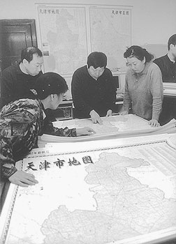 | | 图为编辑及制图人员正在认真审核成品图 | 昨天,本市有关部门根据最新勘界成果绘制的2002年最新版《天津市地图》、《天津市区图》已印制完毕,明天发行。