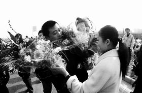 | | 民警丈夫凯旋,妻子送上鲜花。 |