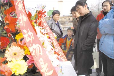 | | 市民将两只花篮送到北京动物园熊山,希望受伤黑熊早日康复。 |