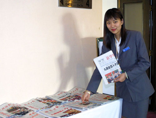 北方网消息:“两会”刚刚开幕,各大媒体的“新闻战”就打响了。在代表下榻的五洲大酒店,每天有近30种报纸免费供代表和新闻记者取阅。大会接待组的刘静小姐说,《新华每日电讯》由于在各大报纸中“两会”报道的版面最多、信息量最大,每天都成为最先被“抢”光的报纸。(记者/刘雁军)