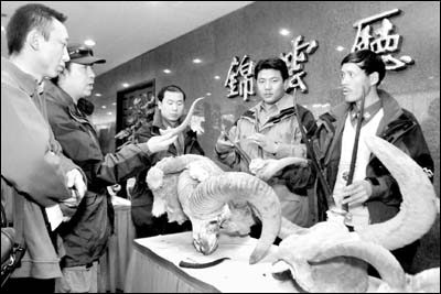 招募保护藏羚羊志愿者的活动在海内外引起强烈反响。目前已有国内外3500多名环保志愿者向可可西里保护区提出了加入申请。该志愿者活动将于5月1日起开始。报名者要准备个人身份证、学历复印件、照片、履历及申请和县级以上医院出具的健康证明寄到管理局。管理局的地址和邮编是:青海格尔木市通宁路88号可可西里自然保护区管理局(816000)。图为“爱立信地球之友队”的藏族队员(右一)介绍他们从盗猎者手中缴获的藏羚羊等野生动物的角和皮。