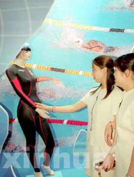 | 北京国际科技产业博览会科技奥运馆运动科技展区, 两位女士在欣赏展示的仿鲨鱼皮设计新式连体泳衣。 在北京举办的中国北京国际科技产业博览会上,科技 奥运馆向人们展示了2008年的科技奥运远景。 |