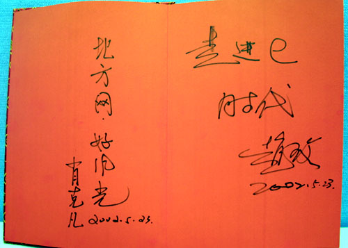 天津市首届青年作家创作奖颁奖大会后,创作奖获得者赵玫肖、克凡为北方网欣然签名