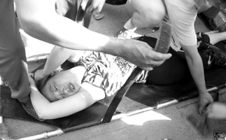 | | 从“飞船”上救下来的乘客,躺倒在担架上 |