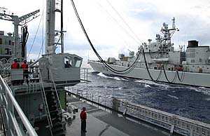 东四区时间6月2日15时,中国海军首次环球航行访问舰艇编队在浩瀚的印度洋中部海域,成功地进行了一次横向补给。“太仓”号综合补给舰保障有力,在整个补给过程中为“青岛”号导弹驱逐舰补给燃油181吨,淡水50吨。图为补给时的情景。