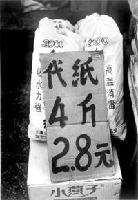 记者在红桥区佳园里一“早市”看到,在市场内几乎每天都有摊位在进行劣质卫生纸的销售。他们销售的卫生纸极其粗糙,纸的表面上往往可以看到附着的一些杂质。如本身是白色的纸张,但中间夹杂着一些红色的纸屑,显然这是用回收来的纸,在经过简单混合后加工而成的,有些甚至还夹杂着一些草屑等。这些纸全都没有外包装,当然也就更无从谈起生产厂家的厂名、地址、质量标准了,都是散装销售的。这些劣质卫生纸大多以每公斤3元或4元的价格进行销售。
