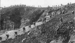 | 为促进国共合作抗日,从1937年2月开始,中共中央派周恩来等同国民党代表和蒋介石等进行多次谈判。图为4月2日周恩来返回延安汇报谈判情况,毛泽东等到机场迎接。 | 为战胜困难,坚持抗战,中共中央号召根据地军民开展大生产运动,“自己动手,丰衣足食”。图为八路军战士在开垦荒地。 |