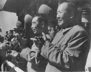 | 周恩来同毛泽东在天安门城楼上。(1960年10月1日) | 党和国家领导人勉励广大知识分子为社会主义建设事业作贡献。图为1963年1月26日,刘少奇、董必武、邓小平、彭真等与100多位科学家亲切会见。左一为钱学森、右一为李四光。 |
