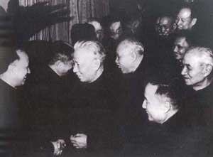 | 1950年5月20日,第一个与新中国建交的发展中国家印度的大使潘尼迦向毛泽东主席呈递国书。 | 1951年3月至4月召开的党的第一次全国组织工作会议,对党员提出了更高的要求。会后开展了建国后的第一次整党工作。图为刘少奇在会上作报告。 |