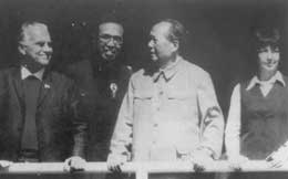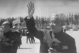 | 刘少奇在乌鲁木齐机场向欢送的人群挥手告别,这是他最后的一次出访。 | 1970年10月1日,毛泽东主席同斯诺及夫人在天安门城楼上。周恩来安排《人民日报》将此照片发在头版头条,这是“文化大革命”以来毛泽东和林彪第一次没有出现在同一画面里(新华社记者摄)。 |