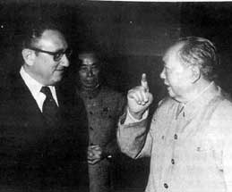 | 1971年10月25日,第26届联合国大会以压倒多数票通过恢复中华人民共和国在联合国内一 切合法权利的提案。中国代表乔冠华(左)、黄华开怀大笑。 | 毛泽东主席会见基辛格。 |