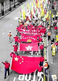 6月30日,香港工联会在香港遮打道至港湾道举行庆祝香港特区成立五周年欢乐大巡游,表达香港群众对香港回归祖国的喜悦心情和对特区政府依法治港的支持。约数千香港市民参加巡游。