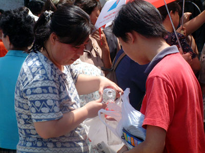 记者在五十五中考场外看到,第一位考生已经走出了考场,妈妈连忙倒上水