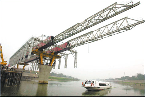 本市第一市政公路工程公司引进挪威技术制造的MSS造桥机现已在东南半环海河大桥工地开始拼装。造桥机重1014吨,跨度55米,处于全国领先水平。用这种技术造桥在我市桥梁建设史中尚属首次,引起国内专家的关注。(庞剑 曹永利摄)