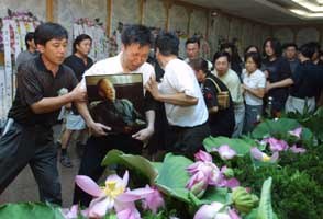 还未进仙逸厅,一股浓浓的荷花香味就飘进了记者的鼻中。走进大厅,与记者前日所看到不同的是,安放孙老遗体的地方,被一些新鲜的荷花所包围,一位从白洋淀刚赶来的中年人正仔细地检查每一朵荷花,将一些摆放不整齐的荷花重新摆齐。荷花带着白洋淀的露珠,带着白洋淀人们的情谊,荷花也在为孙老送行,也在为孙老哭泣。