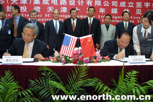 | | 图为摩托罗拉强芯(天津)集成电路设计有限公司成立的签字仪式,天津市人民政府顾问叶迪生为摩托罗拉强芯(天津)集成电路设计有限公司董事长 |