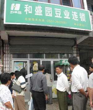 9月14日,记者在南京市江宁区汤山镇中毒事件指挥中心了解到,从当日早晨5点多钟起,汤山镇陆续发现食物中毒者,发势凶猛,200多名中毒者被送往医院抢救、治疗。截止到发稿时,已有多人死亡。图为导致中毒事故发生的和盛园豆浆店已被查封。