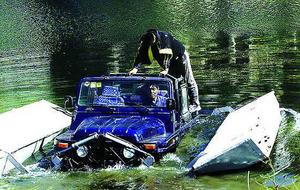 昨天11点,今年52岁、曾做过石油勘探队员的张潜驾驶经过改装的“金旋风”下水,开进两米多深的湖里。试航前,他将车顶的两条浮船缓缓放下。入水之后,浮船的浮力很快将吉普车托出水面。这位设计者脚踩油门,推动操纵杆,吉普车驶入湖中深处。在湖中巡游45分钟后,吉普车安全驶回陆地。