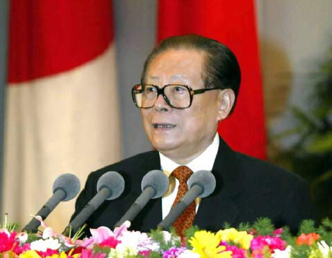 在热烈的掌声中,江泽民发表了讲话。他指出,中日两国是一衣带水的友好邻邦,有着深厚的历史文化渊源和广泛的共同利益。近代以来,两国也有过不幸的历史。日本军国主义侵略中国,使中国人民遭受深重灾难,也使日本人民付出沉重代价。中日邦交正常化30年来,两国关系取得长足发展,人员往来和经济文化交流与合作达到前所未有的程度,政治上形成了重要的共识和指导性原则。中日睦邻友好关系的发展,给双方带来了重要利益,也为本地区乃至世界的和平与发展作出了贡献。