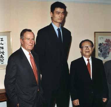 2002年10月24日,在位于美国得克萨斯州的乔治-布什总统图书馆发表重要演讲后,中国国家主席江泽民(右)与前总统老布什(左)、正在休斯敦火箭队效力的中国选手姚明合影。今年6月27日,身高2.23米的姚明当选NBA状元秀,随后前往休斯敦火箭队打球。他以良好的表现受到美国人民的欢迎。中国球员在美参加比赛对加深中美两国之间在体育和文化方面的交流,增进两国人民之间的了解起到了一定的推动作用。