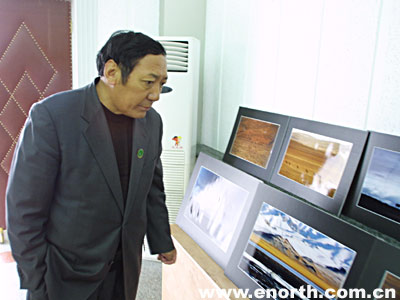 才嘎局长在仪式前参观志愿者王挺拍摄的可可西里图片展