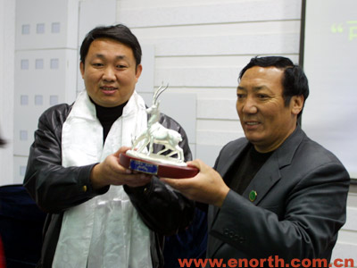 才嘎局长向北方网赠送珍贵纪念品——藏羚羊雕塑