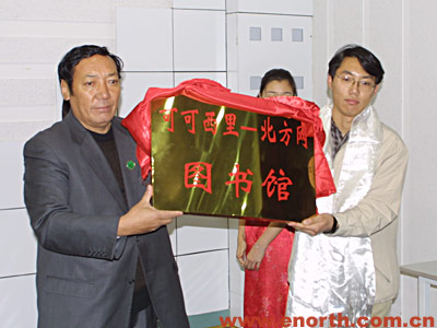 才嘎局长与网友代表“逐浪客”为北方网网友捐赠的“可可西里——北方网”图书馆揭牌