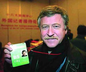 | 昨天,德国记者华友安在北京梅地亚中心展示自己采访“十六大”的记者证 |
