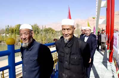 青海省循化撒拉族自治县群众到现场观看乙麻目黄河大桥正式贯通,几位当老人从桥上走过