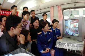 11月8日,在T6次“红旗列车”越南同登—北京国际联运列车上,旅客和乘务员在车厢里收看中国共产党第十六次全国代表大会现场直播。当日,中国共产党第十六次全国代表大会在北京人民大会堂隆重开幕。