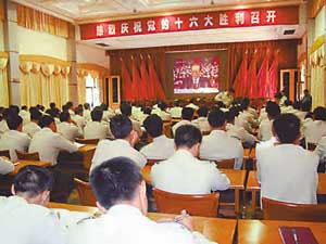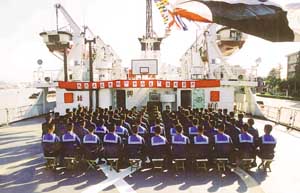 | 某军港内,数条刚从南沙群岛执行任务返航的海军广州某基地海测船大队官兵,在直升机平台上观看十六大开幕盛况。 |