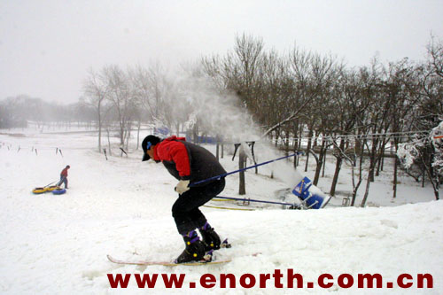 日前,记者来到了刚刚开业的天津水上公园滑雪场,虽然已经开业两天了,但是记者看到这里的雪道铺设工作依然在紧张而有序地进行着。在现场,记者见到一个直径足有一米的“炮筒”架在一个高坡的下面。在机器的隆隆声中,一些雾状的白色颗粒从“炮筒”中不断地喷向天空,随后又纷纷落下。使原本光秃秃的雪道,霎时变成一条银龙。雪场的工作人员告诉记者,这个“炮筒”就是造雪机,是从加拿大恩威公司引进的,价值人民币40多万元,它每小时的产量是80立方米。天气越冷的时候,造雪的产量就越高,就本市的气温来说,零下4-5摄氏度时最适合造雪。因为昨晚本市已下了一场大雪,所以现在地上的积雪已有一尺多厚。